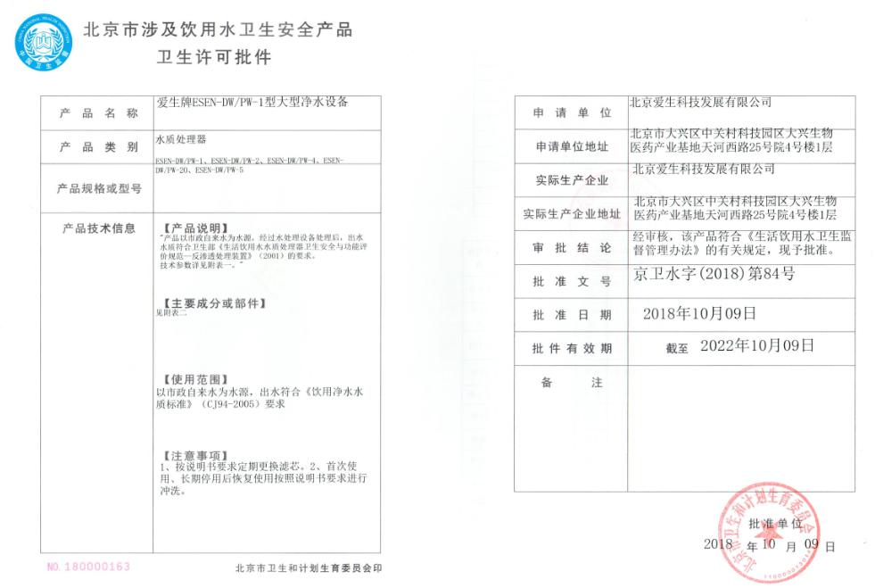 2018年8月底,愛生在長達十個月準備的新一期衛(wèi)生批件申請,一次通過北京疾控中心組織的專家上會評審,產(chǎn)品及能力均獲專家首肯;2018年11月,經(jīng)北京市衛(wèi)生和計劃生育委員會批準,愛生拿到了第5張批件許可,成為北京地區(qū)為數(shù)不多的具備大型直飲水設備制造能力的專業(yè)企業(yè)。
